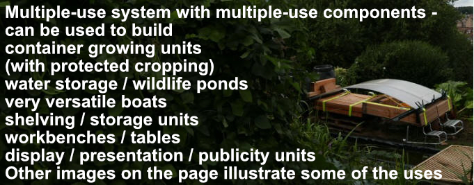 Building boats and much, much more has material on a versatile, flexible system which can be used to build container growing units (with protected cropping), water storage / wildlife ponds, very versatile boats, strong tables and workbenches, shelving, storage units and units for presentations, displays and publicity - and more. This page gives further information.