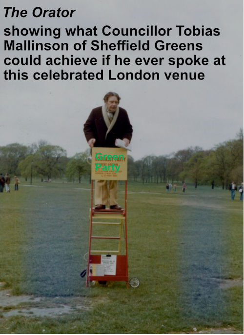 The photographs of Councillor Dimond in action outside Sheffield Town Hall were not taken by me. I contacted the party to request permission to use the photographs, with blocks obscuring the faces and there was no objection. They show a side of the Green Party which seems not to embarrass the party in the least, not to be a source of shame or regret. In his public persona, this Sheffield Councillor seems to me more like a Nazi Stormtrooper or Nazi agitator rather than a representative in a liberal democracy. To me, this is someone who likes telling people what to think but I doubt if he can explain the reasons for his views or defend his views. Perhaps he is, after all, a very timid person. The appearance of complete confidence is very misleading, surely. Can he defend his views? Can he defend his own behaviour?