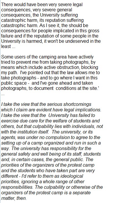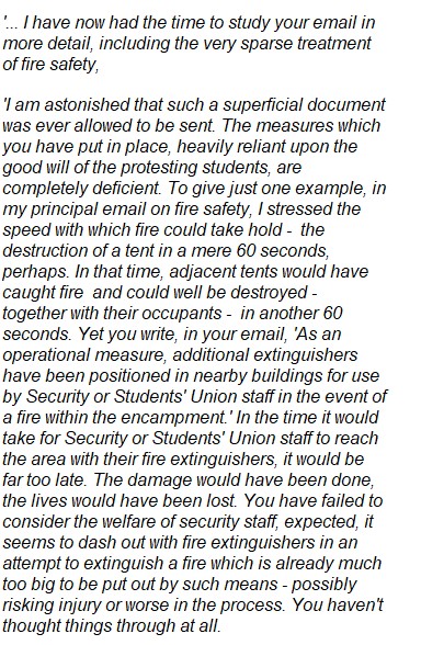 I wrote to the Vice Chancellor in May to inform him of the serious fire risks. The camp was allowed to continue until July - before that time and during that time, the University Concourse was a potential death-trap The Vice Chancellor failed to take effective action. If he had taken action to evict the students and end their action, he would have faced a barrage of criticism from UCU members, and many others. But these aren't extenuating circumstances. All he had to do was explain why he had to take this action - to protect the protesting students. I was concerned about the welfare of the protesting students, even though I oppose their ideological reflex actions. How could the UCU possibly oppose the closure of the camp, once they realized that the encampment was 'playing with fire?'