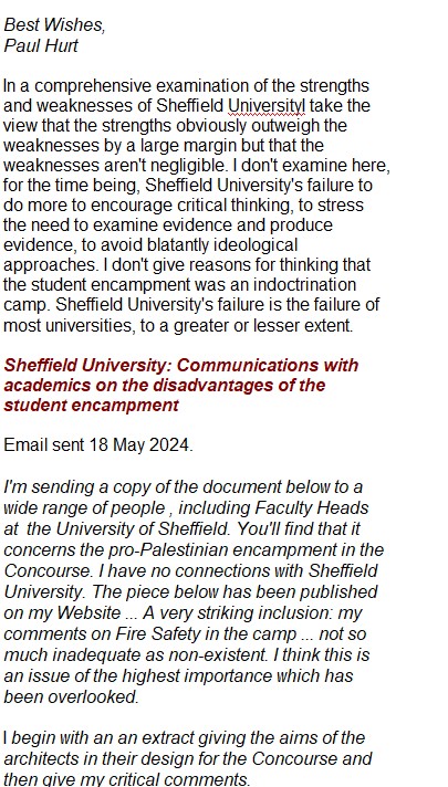 If Robyn Orfitelli of the Sheffield University UCU group - or any other members of the group - could give me any thoughts they may have on the Health and Safety issues arising from the Student Encampment - in particular the very serious fire risks arising from the large number of tents in very close proximity - then I'd be glad to receive them but it seems overwhelmingly likely there will be 'No comment.'