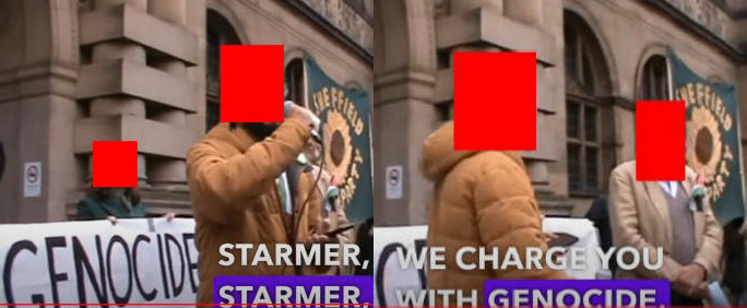 Above: Outside Sheffield Town Hall, the ludicrous Councillor Dimond of the ludicrous Green Party makes the ludicrous claim that Keir Starmer is guilty of genocide. He asks the crowd to chant, 'Starmer, Starmer you can't hide, we charge you with genocide and the crowd obliges.
