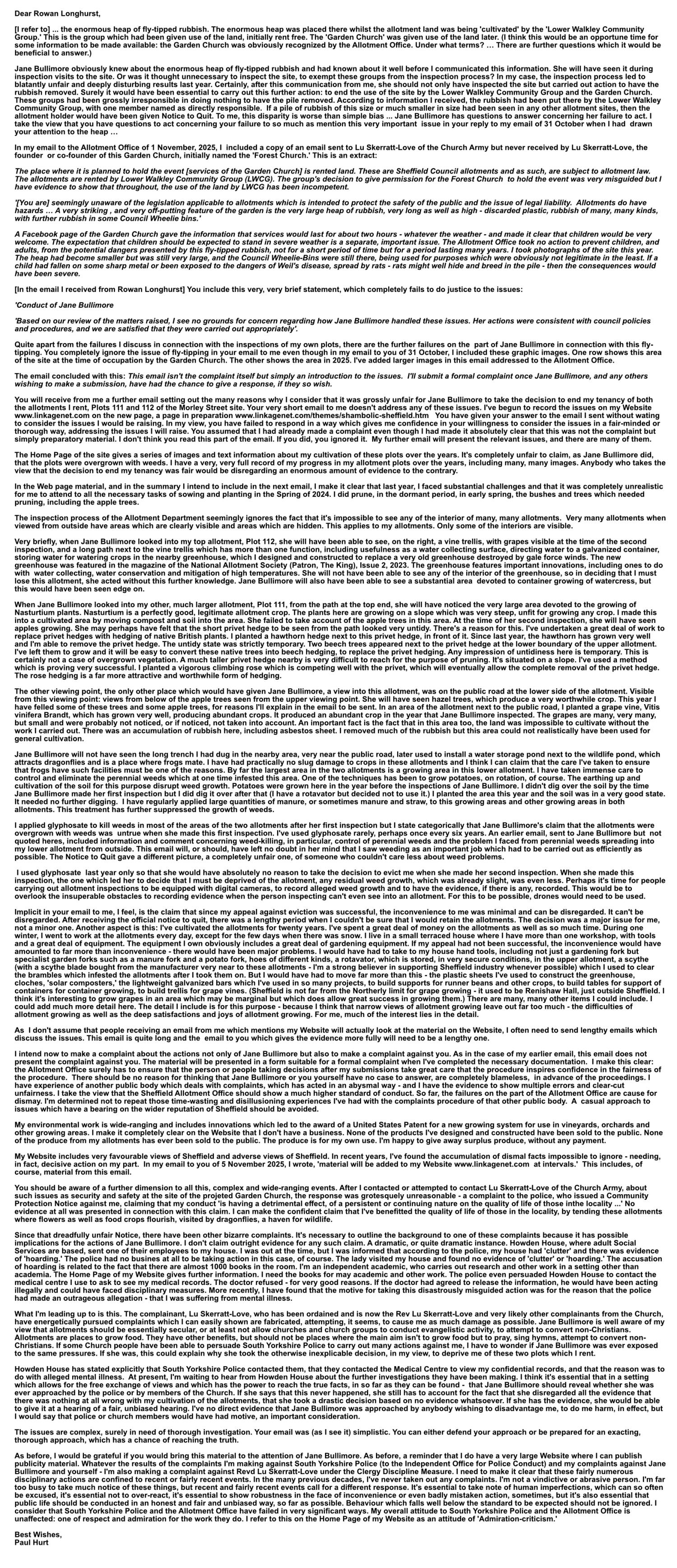 I can easily show that Jane Bullimore's decisions (in 2024) were based on multiple errors, some of them serious ones. I'll be presenting the evidence here. The decisions were eventually reversed, but the events form part of a wider pattern, taking up a very great deal of my time, requiring a very great deal of work which has taken me away from other work. The apparent simplicity of the situation - allegedly overgrown and uncultivated land, the enforcement of reasonable sanctions - was nothing of the kind. The background is wide-ranging and disturbing and I have the evidence, including emails from me to Jane Bulimore about weed control, allotment law and many other issues.