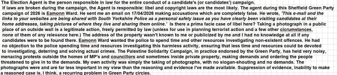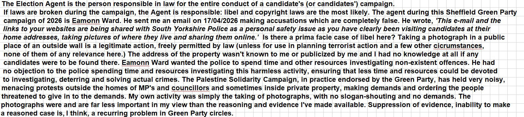 With an election due on May 7, the page Publicizing and criticizing Green Party candidates is a focus for my attention. See also Don't vote for the Green Party. Don't donate to the Green Party and Shambolic Sheffield: Criticism of a police force (SYP), a political party (the Green Party), a university and student encampment, an allotment office, mayor, and more, a project with material on more than a single page. Below, Introduction to Shambolic Sheffield. Appreciation for Sheffield's hills and valleys (many images):Sheffield Dales.