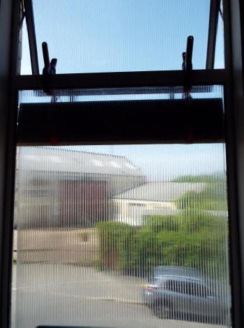 Below, the view from within the room - the nesting box just outside the window, held in place by two of the clamps, which also support one of the polycarbonate sheets, and the view of the motor body repair shop across the road. I could achieve a clear view of the motor body repair shop by using a different method of protecting swifts and other birds from colliding with the window. I prefer to use these polycarbonate sheets. They can obviously be removed at the end of the swift season.