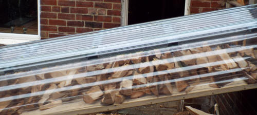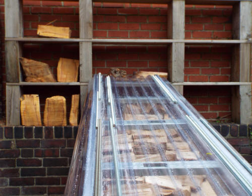 The logs are supported on three scaffolding boards, which are supported by a galvanized bin on the left and the wall on the right. The PVC roof is supported by two aluminium C-channels, which are light, strong and cheap. There are four short sections of C-channel inserted into the two long sections, to give support to the PVC throughout its length. Another PVC sheet, placed vertically, forms the wall of the log store to the South.
