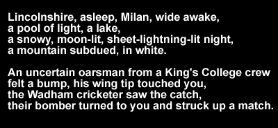 The poem is about the disaster which overtook a bomber flying over the Alps. The bomber might have cleared the mountain, if only just. As it was, a wing tip made contact with the mountain but then the bomber's flight was deflected. It turned towards the mountain, crashed into it and exploded. This is a grim parody of a romantic encounter, with the mountain as a reticent lover or bride.