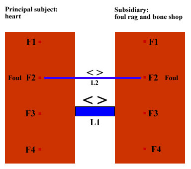 In the line 'Our love calls tiny as a tuning fork' there's interaction between 'love,' the principal subject, and 'tuning fork,' the subsidiary subject. I recognize the importance of interaction but I use to begin with a term at a much higher level of generality, linkage, which I notate symbolically as < >. In the diagram above, the principal and subsidiary subjects are shown as two coloured blocks. The linkage between them is shown as the broad blue line, the linkage line L1. For the time being, you can ignore the factors F1 - F4 in both Subjects and the thin blue line, another linkage line, L2, which links F2 in the Principal Subject and F2 in the subsidiary subject.