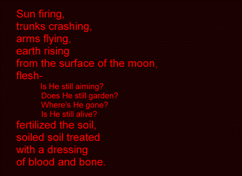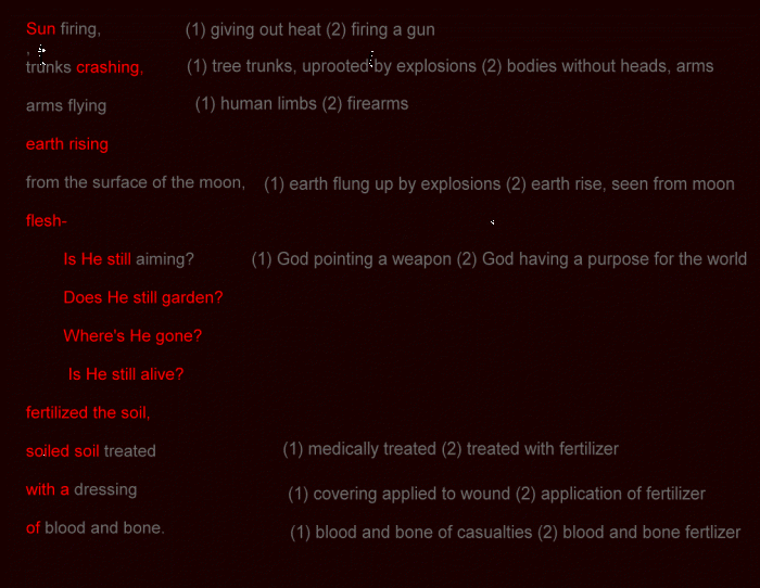 Before the insert in the centre of the poem, the main metaphor is lunar, the battlefield transformed (by, for example, the crashing of tree-trunks) into a world without vegetation. Photographs of such battlefields as Passchendaele show a world like this.