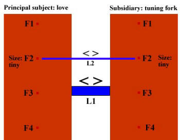 F1 - F4 are given in the diagram above for the Principal Subject but only F2 is identified. 'Magnitude' is admittedly a very inadequate way of expressing any factor of love, but it's an advantage to use the same term for love and tuning fork, both described in the line as 'tiny.' In this preliminary approach, which is necessarily concerned more with exposition than with nuances and complexity, or the wonders and frustrations of love, then the use of the inadequate term is allowable.