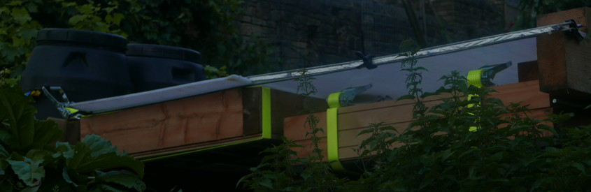 This is an area which would provide standing room for a punter, or space for a comfortable chair, or space for stacking loads. When the system is used for purposes unconnected with linking, there are a large number of other uses. For example, it can be used for container gardening. When the upper surface is cleared, the whole area can be used as a viewing platform - in my experience, a very interesting way of viewing a garden. In this system, the bow of the boat can become the stern and the stern can become the bow. A punter standing in the area shown in this image would propel the boat to the left. A punter standing at the opposite end would propel the boat to the right. In this case, the curved polycarbonate could not be used in the position shown in these images, but the polycarbonate sheets can easily be relocated. In another configuration of the boat, an alternative bow can be added. The 'standard' bow is square, as used in many boat designs, including punts. A V-shaped bow can be attached, or other shapes, which will have advantages in certain water conditions.
