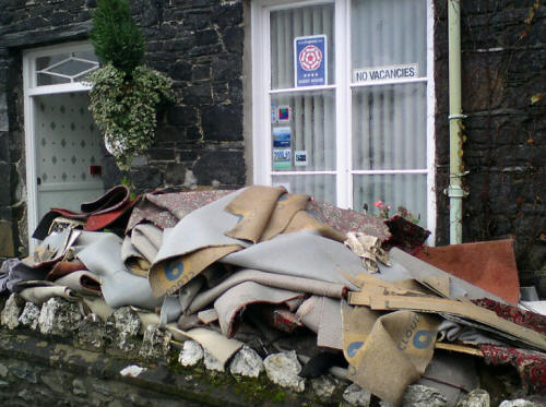 The first image in the group above shows the rescue of people affected by the severe flooding of 2015 in York. The second image conveys an impression of flooding as catastrophe in lurid light. This is followed by another image of the York flooding and an image of a stricken car, location unknown. In the fourth image, the property is in Keswick and the flood water came from the River Greta, a tributary of the River Derwent..