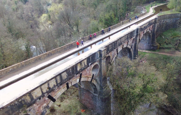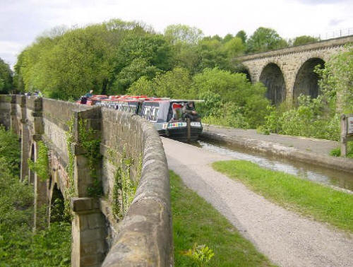 This is a view of the wondrous Marple Aqueduct, which carries the canal high above the River Goyt. Clearly visible from the aqueduct, but not shown in this image, is the railway bridge, also very high. The aqueduct is the highest canal aqueduct in England and the highest aqueduct built of stone in Britain.