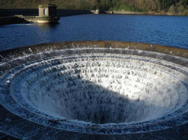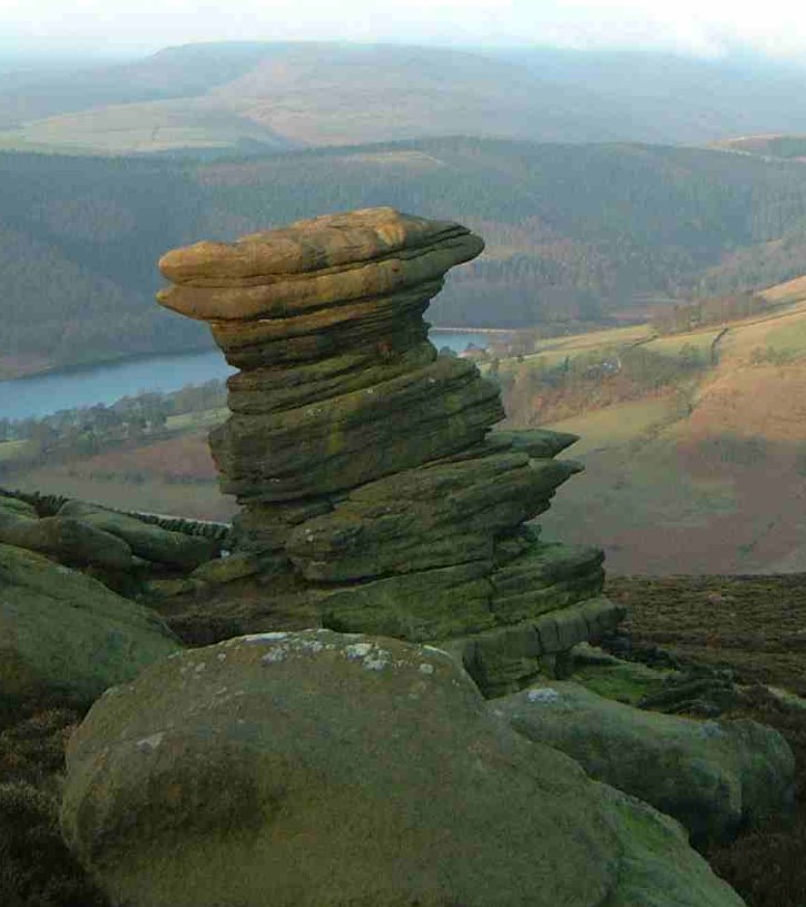 Above, the Salt Cellar, a tor (rocky outcrop) at Derwent Edge in the Dark Peak. The geology of this area is millstone grit, which originally covered all the Peak District. Most of it was removed by glaciers in the last Ice Age. The millstone grit remains in this area and makes up the edge of a peaty moorland plateau above Ladybower Reservoir, visible in the image.