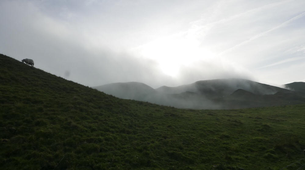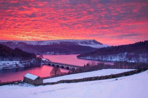 Above, part of Ladybower Reservoir at dawn. This photograph, and the photograph above, not taken by me. The road leading from Sheffield to Ladybower rises steadily and then there's a downhill section, leading to Ladybower Reservoir. The border between Sheffield is in the higher section. Walking from Sheffield - or taking the easier way, driving from Sheffield - the walker (or driver) follows the road by the shoreline, not taking the branching road over the bridge, which leads towards the Derbyshire village of Bamford and then a road which leads to Hathersage, to the left, and the villages of Hope and Castleton to the right. After Castleton, a steep road leads to Edale, the start of the Pennine Way.