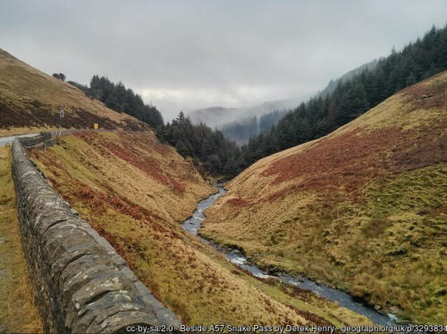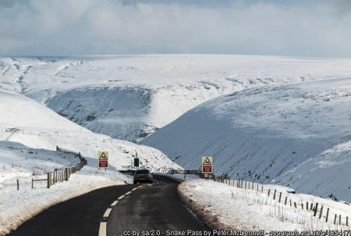 Above, the Snake Pass is a main road through the Derbyshire Peak District, between Glossop and the Ladybower Reservoir.