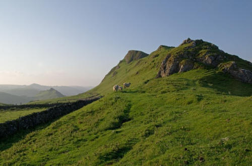 Above, very near the border with Staffordshire, in the valley of the River Dove: Chrome Hill, to the left Parkhouse Hill.