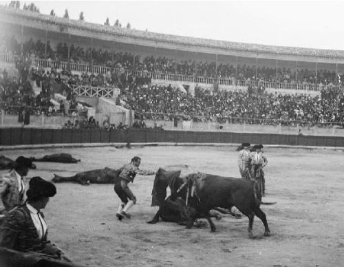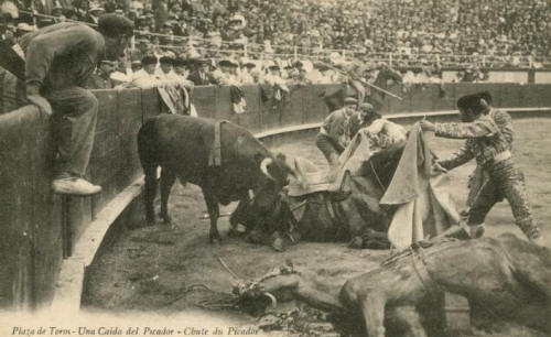 'The bay, its teeth chattering with fear, having been in before, stood near the barrier below us, the motley red and white striped bandage over its offside eye, its ears stuffed with tow, and tied with what seemed to be old electric wire. The Bull made short work of the bay horning the horse from behind. The picador cleared, and the horse beaten to its feet by red-shirted attendants. There, from the underpart of its belly hung a large protuberance of bowels. With head outstretched a man hauling it along on the end of the rein, another hitting it with a stick, it was led out.