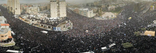 Above, mass demonstration in Israel to oppose conscription into the Israeli Defence Force of Yeshiva (religious school) pupils