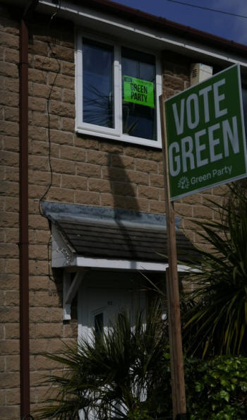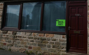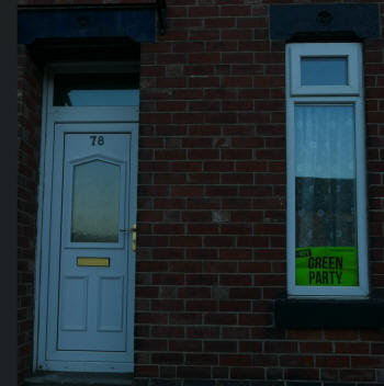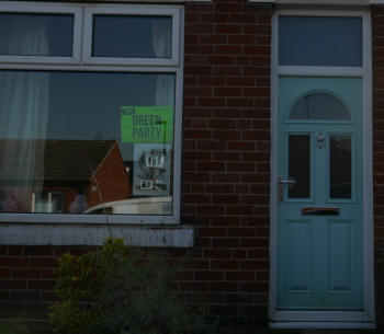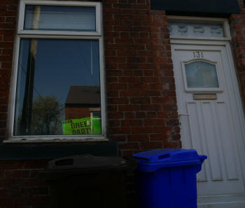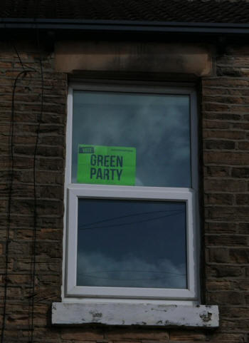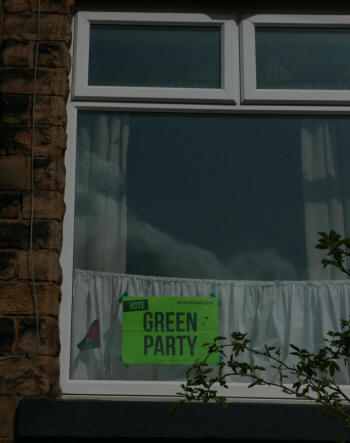 In this column, photographs of Sheffield properties publicizing the Green Party. There are many, many more which I could include but which it would be unrealistic to include, but more will be added.